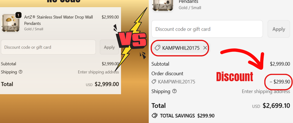 I type KAMPWHIL20175, click apply, and immediately see 10% deducted from the total.