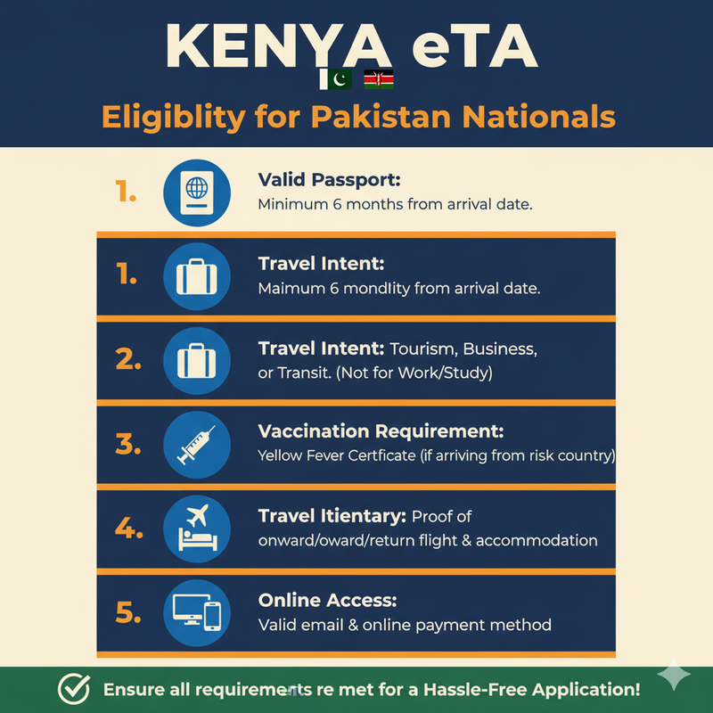 The Pakistani visitors need to fulfill certain requirements to be eligible to Kenya ETA: