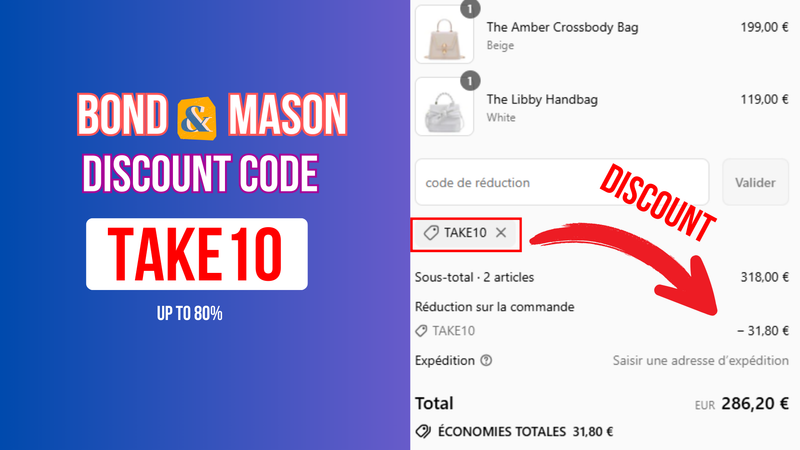 The Bond and mason coupon Code: TAKE10 is your golden ticket to massive savings. Even if products are already discounted on the website, entering the code TAKE10 at checkout gives you an extra discount, helping your total savings reach UP TO 80% OFF.