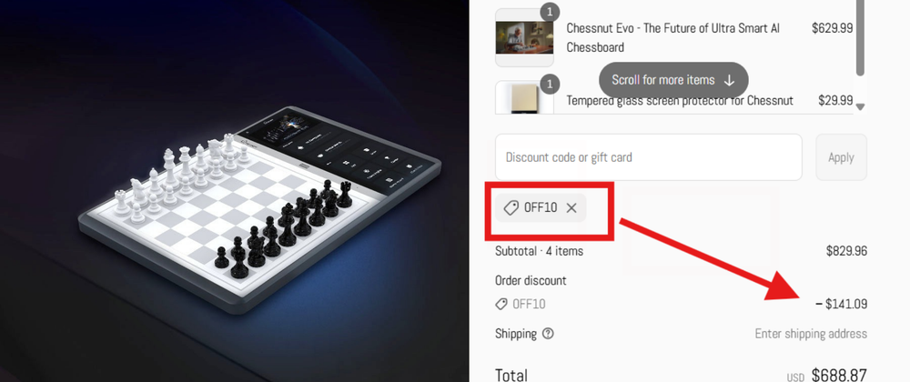 The Chessnut coupon code and promo code OFF10 applied correctly and reduced the price without any issues.