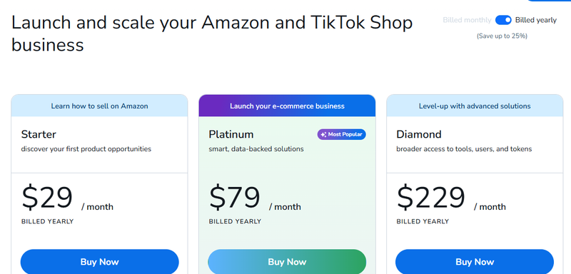Helium 10 offers flexible pricing tiers designed for different levels of Amazon sellers.