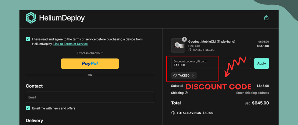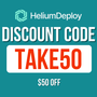 The Helium Deploy coupon code TAKE50 is a verified coupon that gives $50 off instantly at checkout on eligible orders through an official partner link.