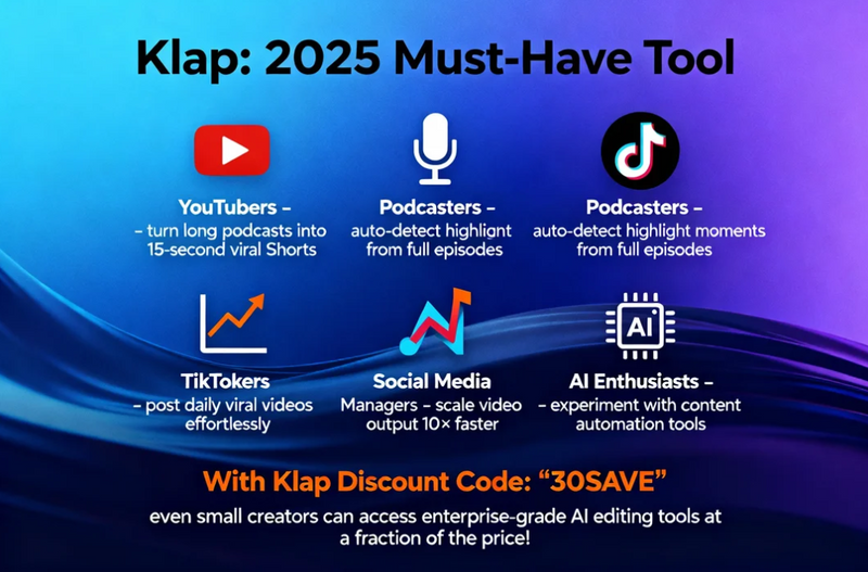 👉 Start today. Create faster. Grow bigger. Save more. Use Klap Coupon Code: 30SAVE now!