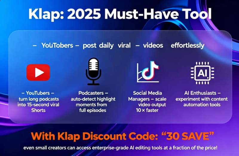 Right now, Klap is offering a special promotional event, and when you apply Klap Promo Code: 30SAVE, you unlock up to 55% OFF on premium plans. This is a limited-time 2025 discount designed for creators, agencies, coaches, and businesses that want to scale video production without spending hours editing.