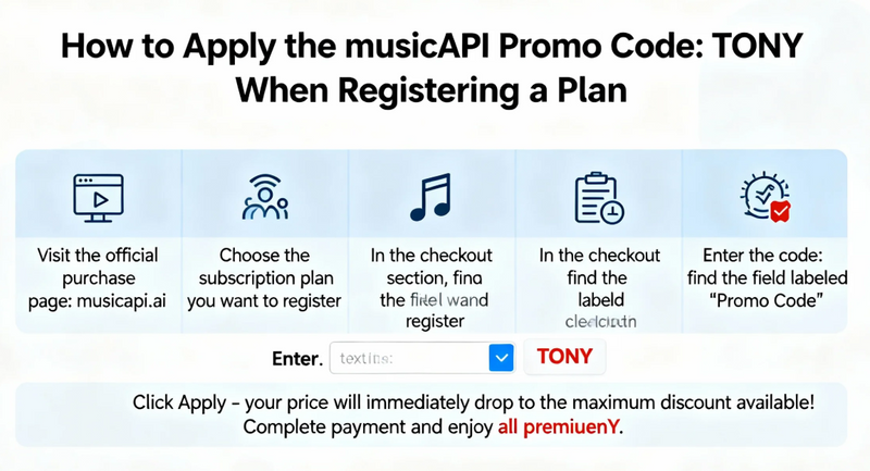 Using musicAPI Promo Code: TONY is not just a discount—it is the smartest and most profitable choice for anyone registering a plan on musicAPI this year.