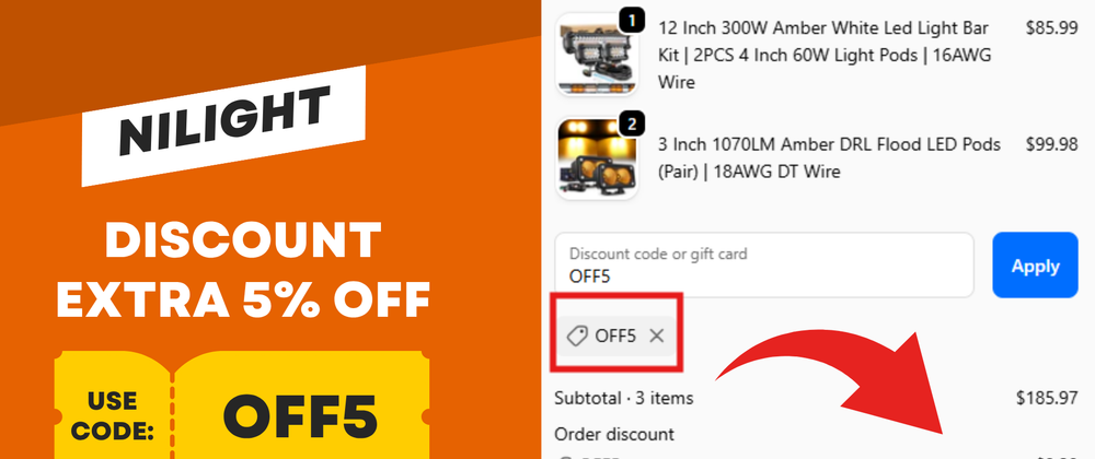 The Nilight discount code & coupon code OFF5 is currently the most reliable way to save extra money on Nilight LED products in 2026. While many older Nilight codes no longer apply, OFF5 is verified, tested, and confirmed working, offering an extra 5% OFF on Nilight LED light bars, pods, and automotive lighting accessories.