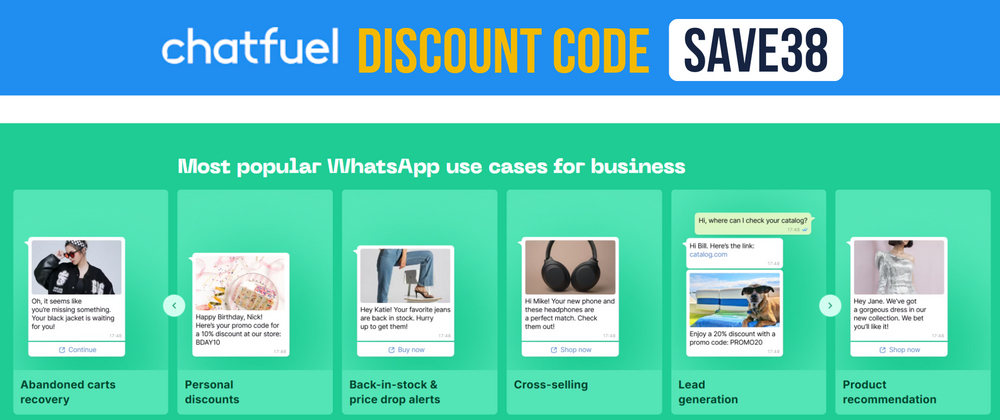 Quick Tip: Use Chatfuel Discount Code SAVE38 to get $38 OFF on any plan. Works on new or discounted plans—don’t wait, these deals won’t last!
