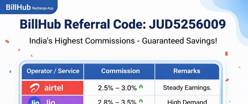 If you want to earn while paying everyday bills, Bill Hub is a smart choice. By using the Bill Hub Referral Code JUD525609, you get an instant ₹150 signup bonus, cashback on recharges, and a referral-based daily income system.