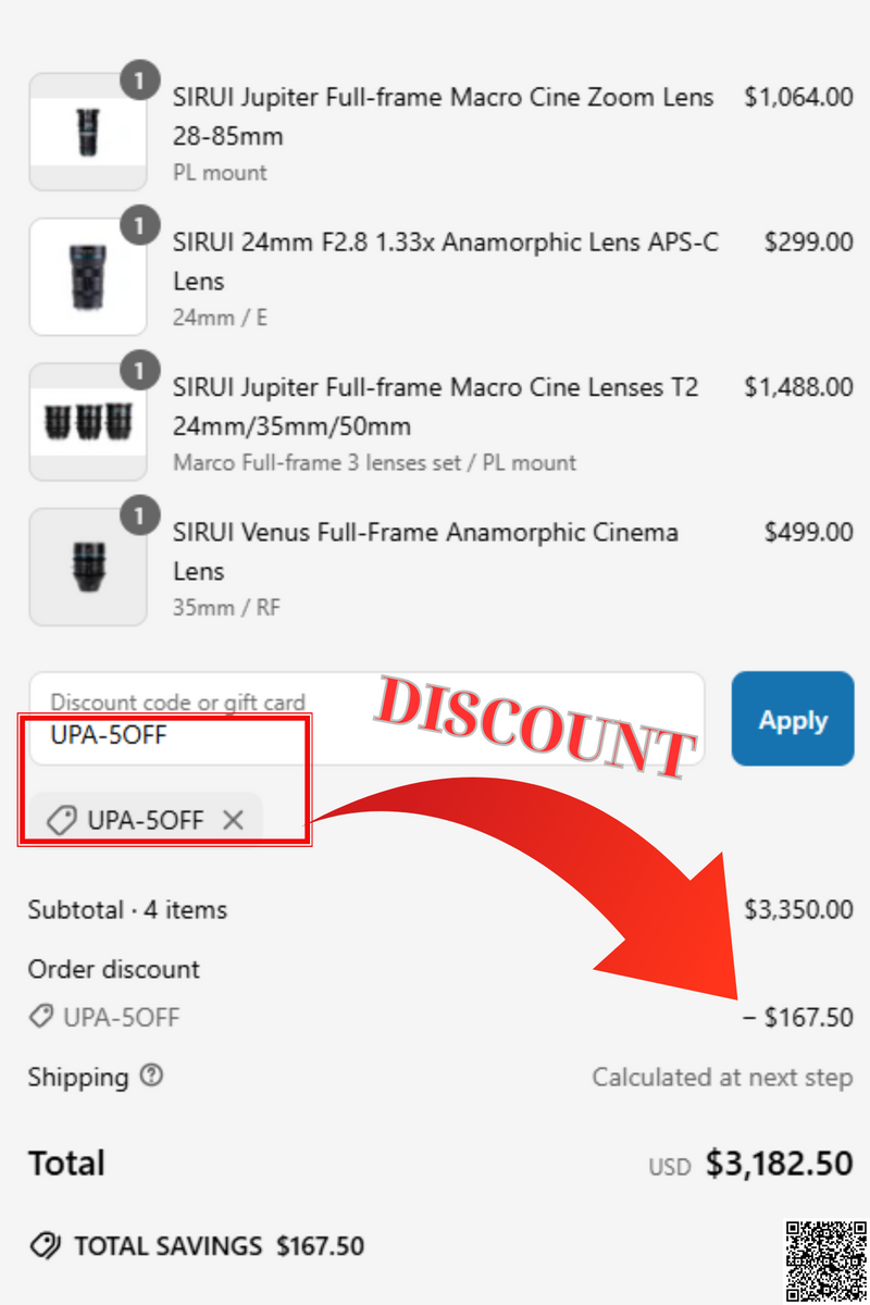 👉 Step 4: Enter Sirui promo code: UPA-5OFF to unlock an extra 5%