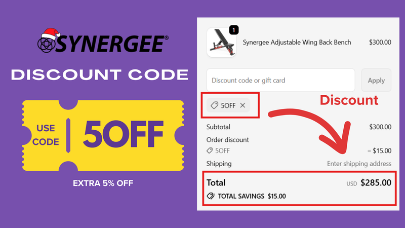 The Synergee Fitness discount code 5OFF is a verified and working discount that gives you an extra 5% OFF on Synergee home gym equipment. Updated for 2026, this discount code helps shoppers save instantly on racks, bars, benches, and essential training accessories.