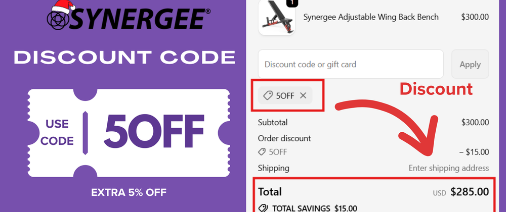 The active Synergee Fitness Discount Code is 5OFF, giving you extra 5% OFF at checkout in 2026. This limited-time verified offer is confirmed working and applies to barbells, bumper plates, and home gym equipment. The discount is deducted instantly before payment. If you’re upgrading strength gear, apply it before cart pricing or stock availability changes.