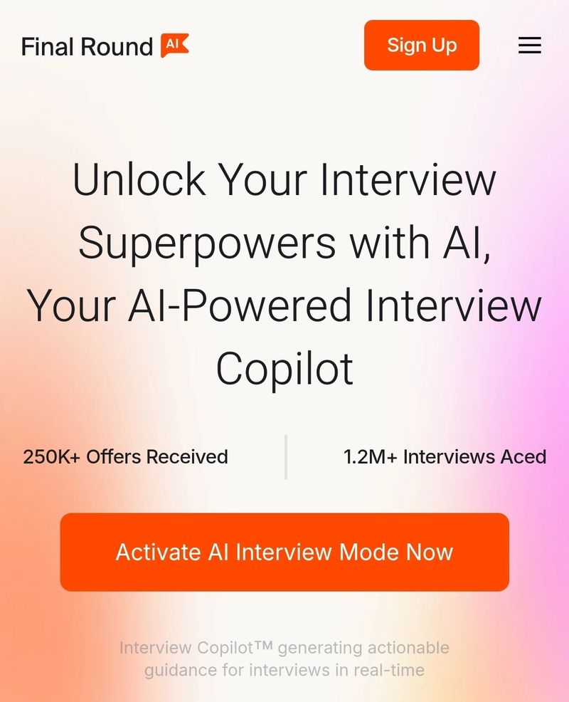Final Round AI is an interview preparation platform built around its Interview Copilot™ feature. This tool connects to your video interviews on platforms like Zoom, Google Meet, or Teams, offering real-time suggestions based on your background and the role you're pursuing.